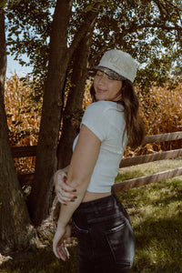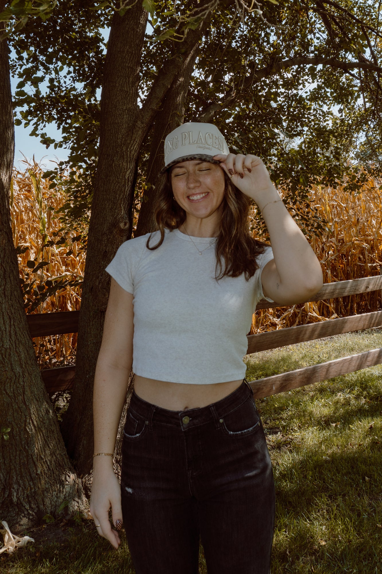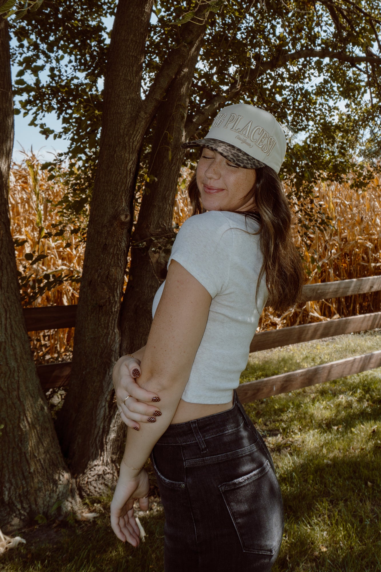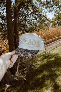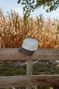 Nothing better than a hat perfect for ALL of your tailgate needs, not matter what team you're cheering on! This vintage style trucker hat features a leopard print bill on a cream base with "GOING PLACES! (tailgate)" embroidered wrapped across the front of the hat in puff letters
