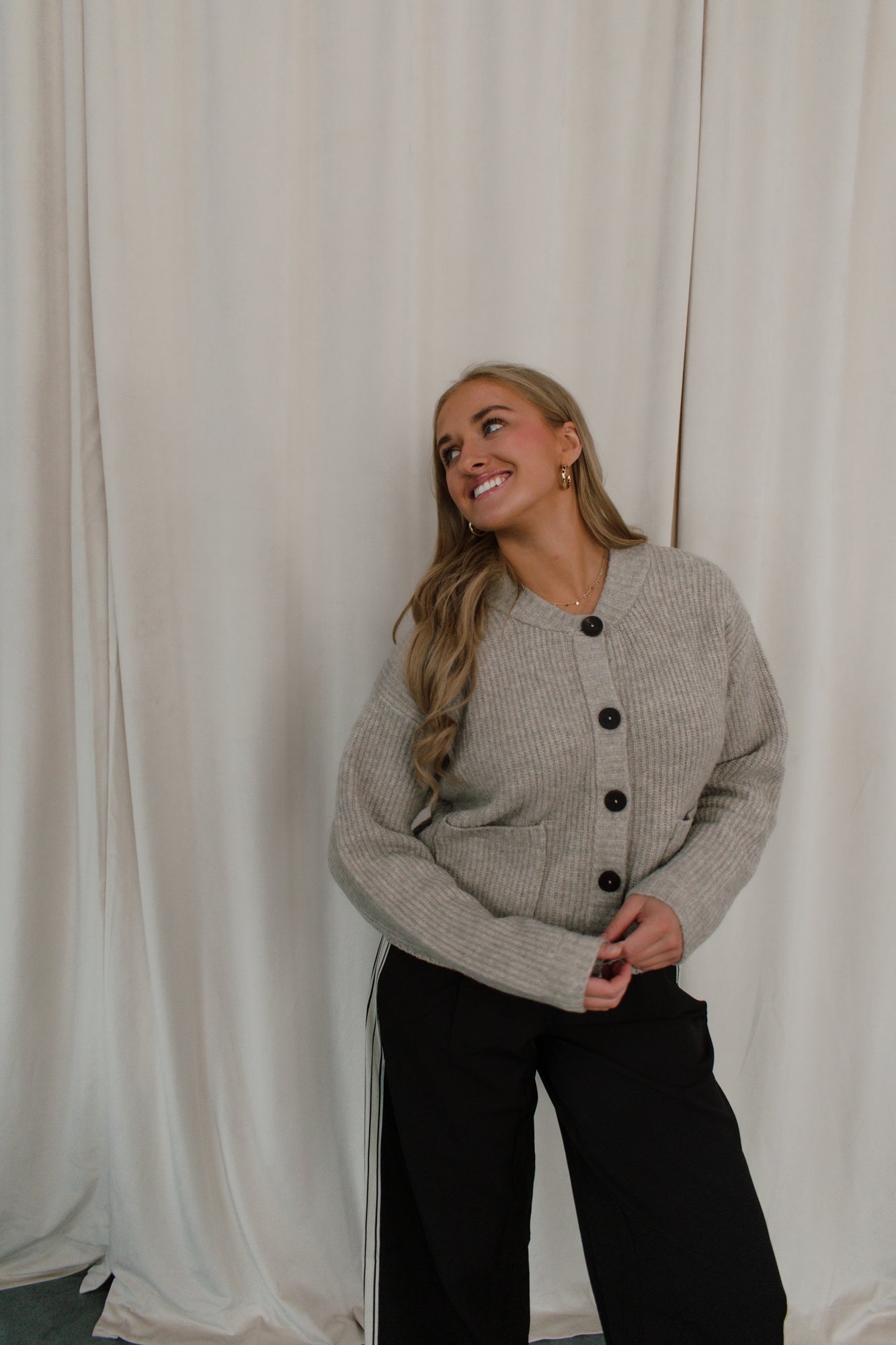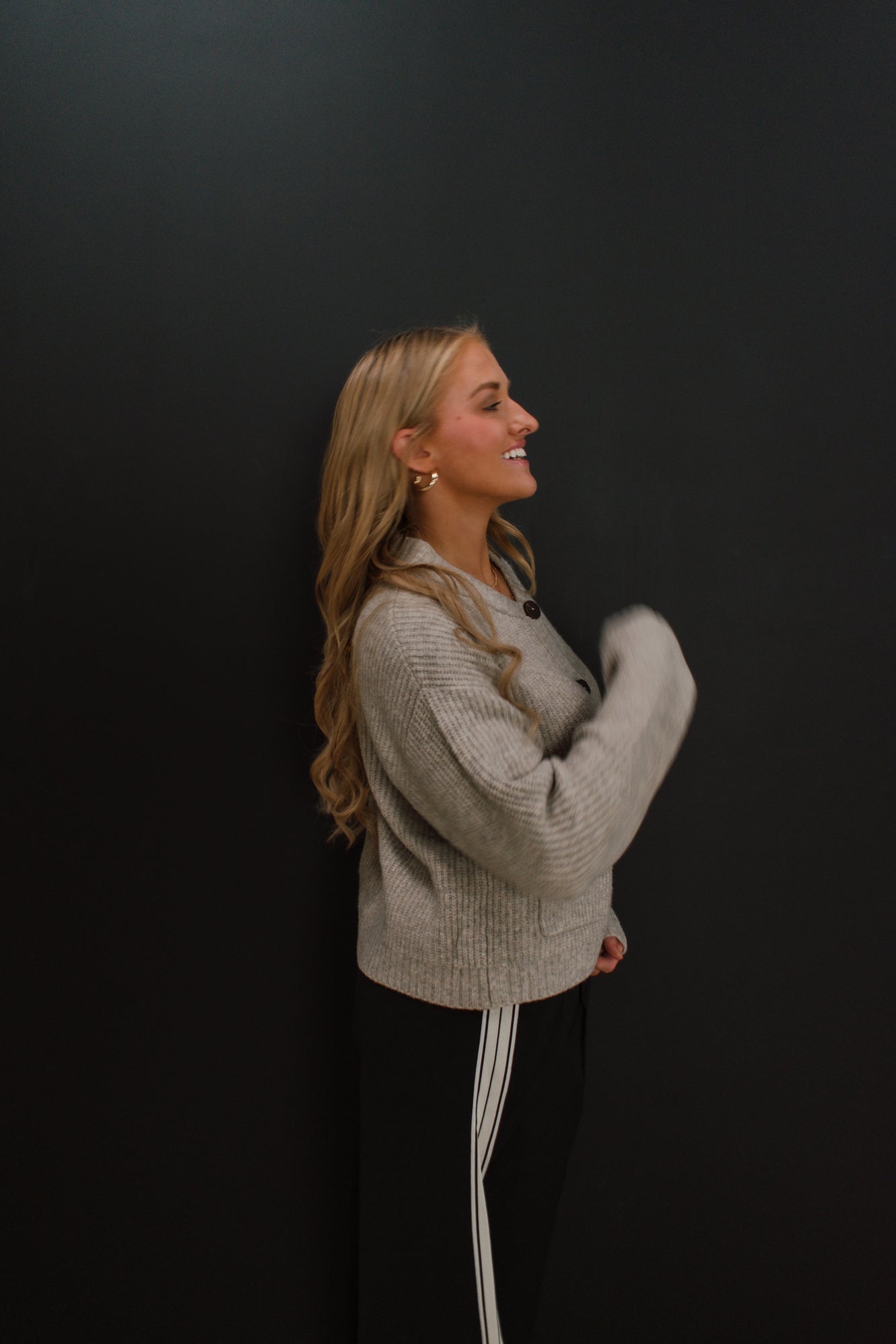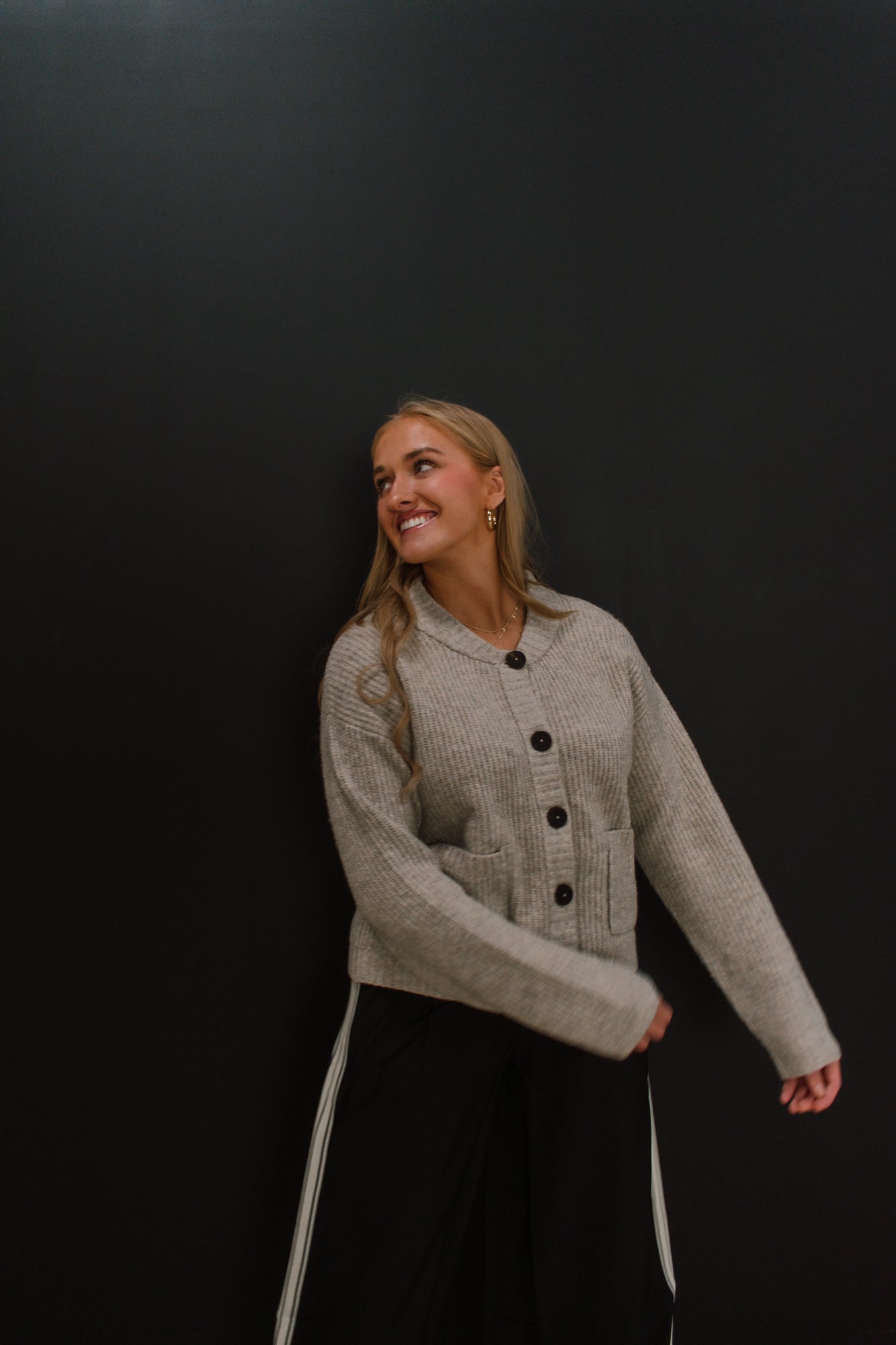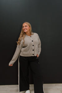 Staple cardigans are the best basic to fill your closet with this fall. Our new Dionna Cardigan is the perfect, warm grey knit sweater with large brown buttons, in a classic waist-length style. Pairs perfectly with all of your jeans, skirts, & trousers for endless outfits.