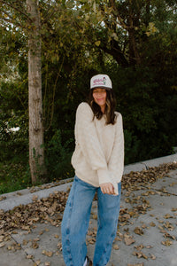 Fall is in the air & you need this sweater in your closet !!! Our Margo Textured Sweater is the perfect cream, knit sweater for your fall wardrobe. Runs slightly oversized for a comfy, slouchy fit.