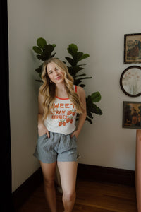 Nothing sweeter than a classic tank for the season. Our new tank top from The Laundry Room is the perfect, white ribbed, scoop neck style with an adorable strawberries graphic on the front with red piping on the neck and arm hems.
