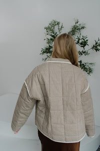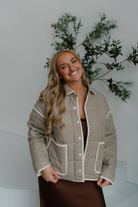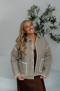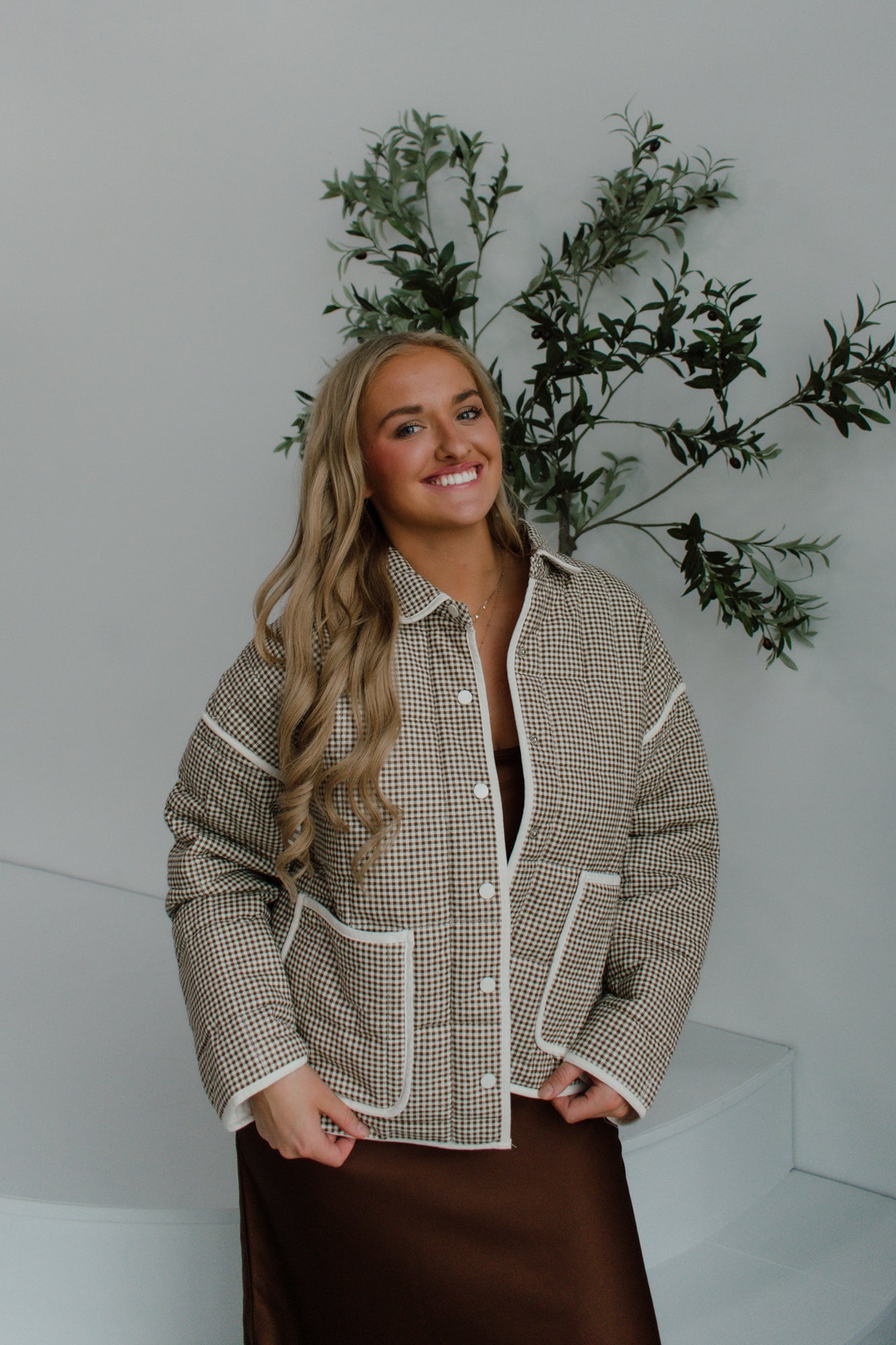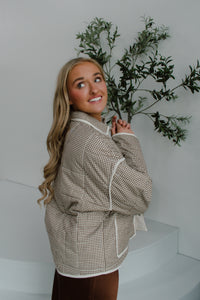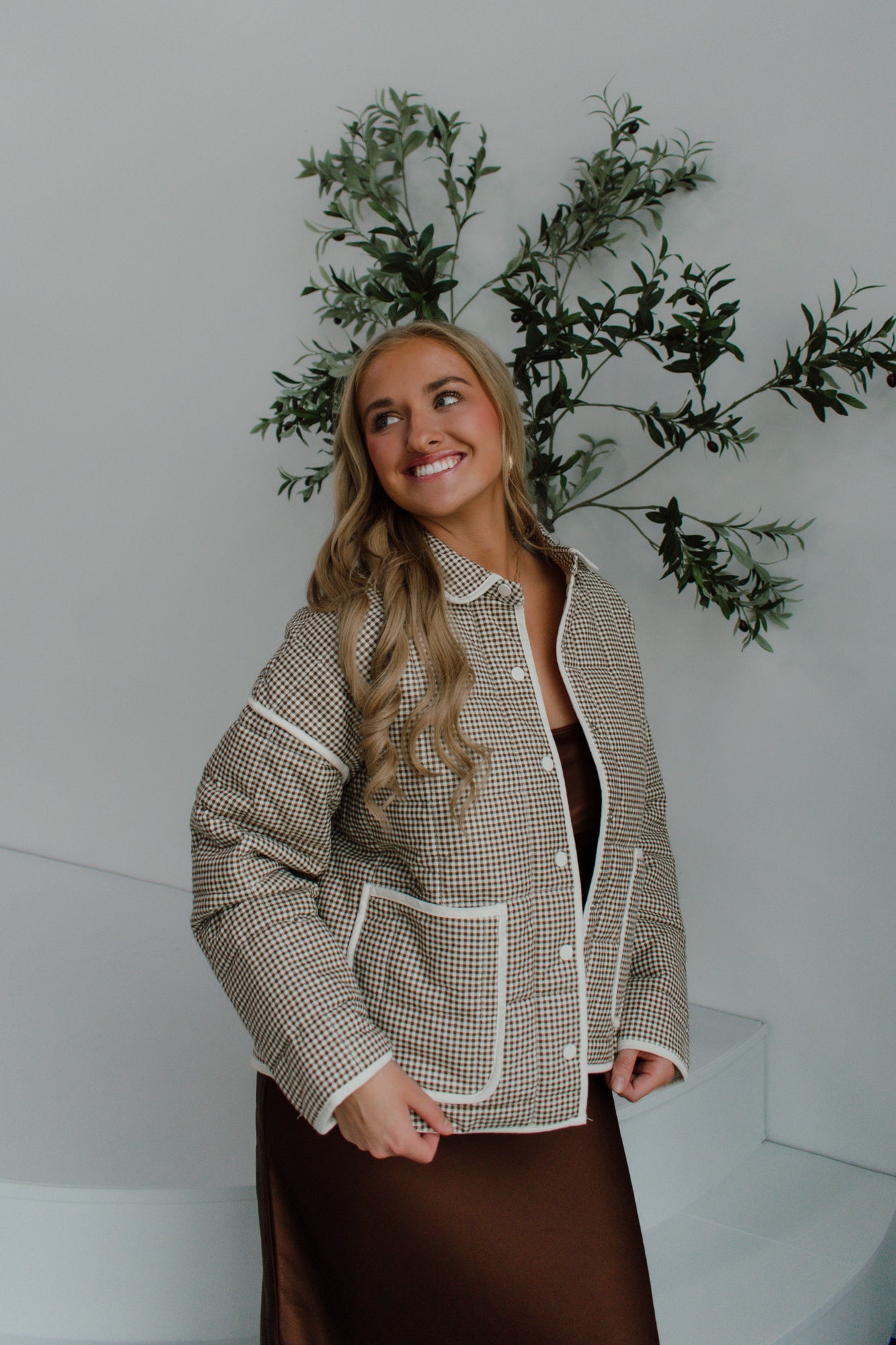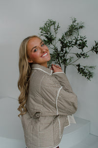 Here for gingham all year round !! Our new Chai Gingham Jacket is the perfect quilted style for all of your fall needs. The boxy fit pairs perfectly with jeans, over dresses, or styles with your favorite skirts. Features the adorable tan gingham pattern, collar, 2 patch pockets on the front, and snap button closure.