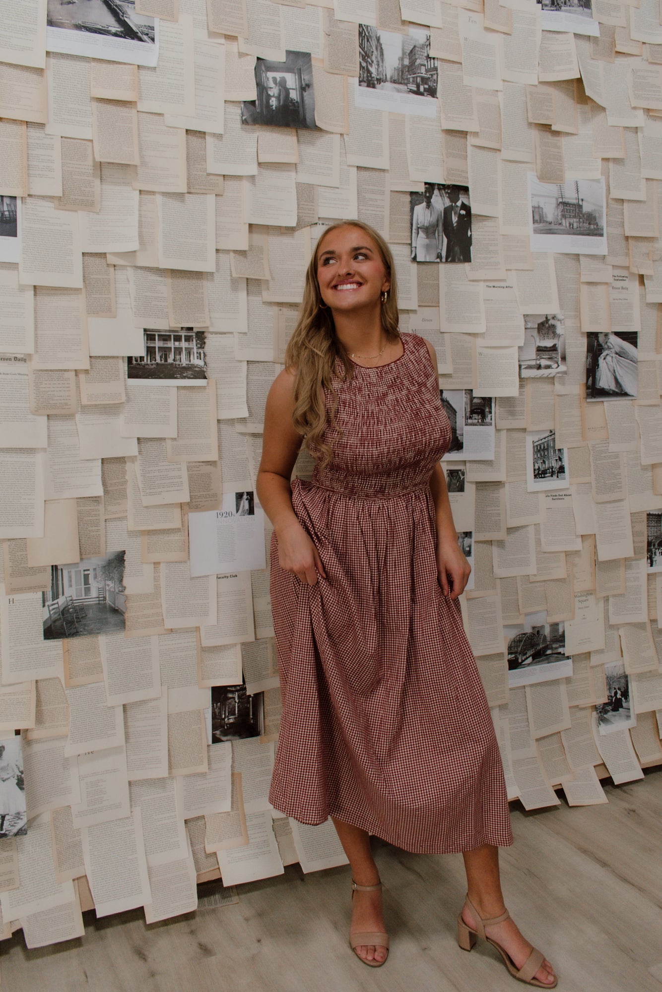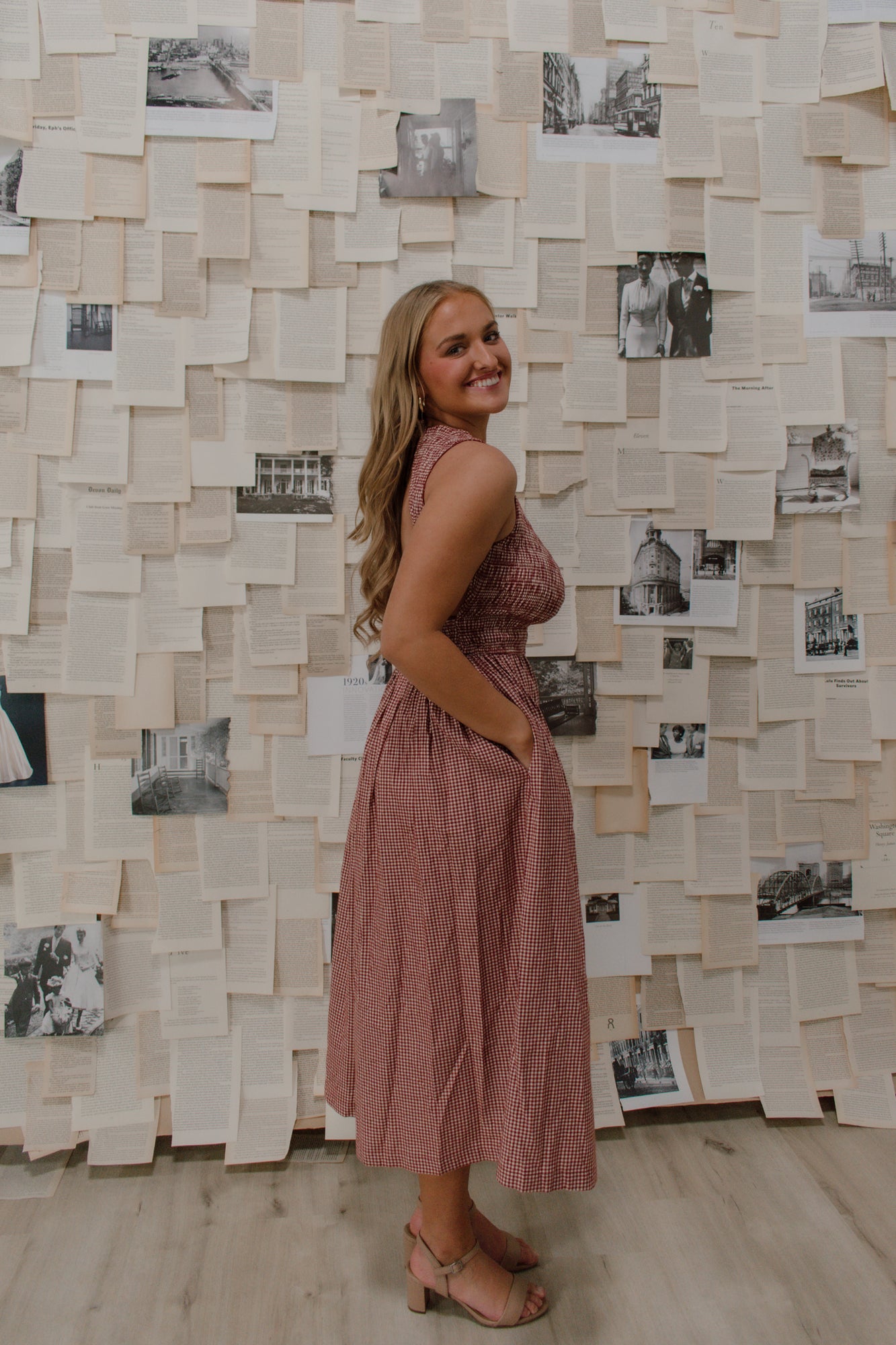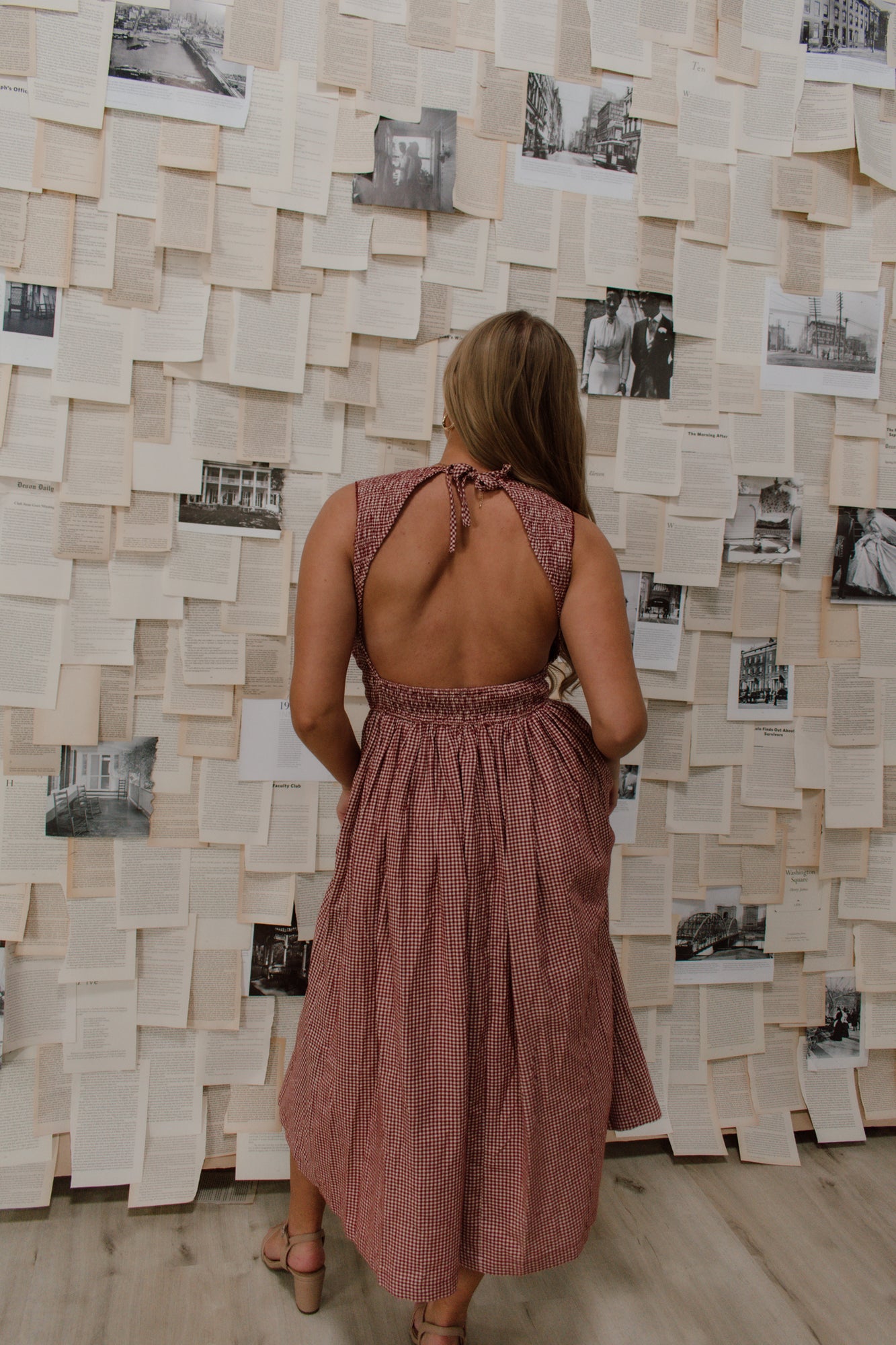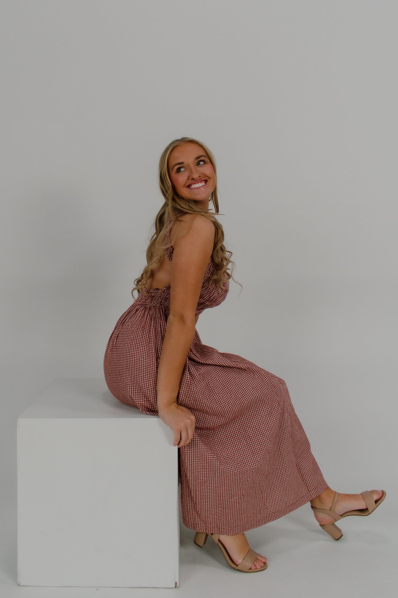 Autumn dressed up in it's FINEST form in our new Charlotte Midi!! This adorable, chic gingham dress features a smocked top with a drop waist fit and open back. Features 2 side pockets (a game changer) and tie back for adjustability on the top.
