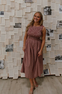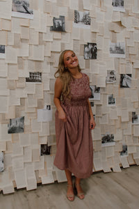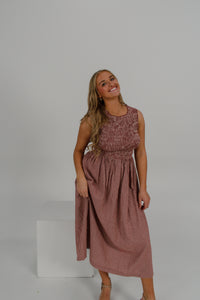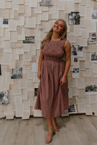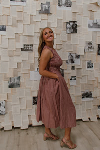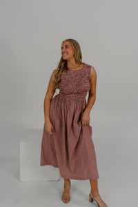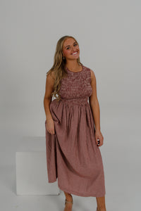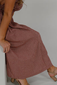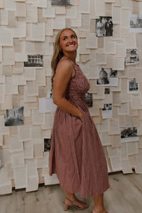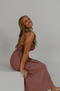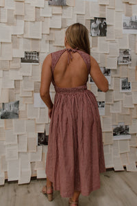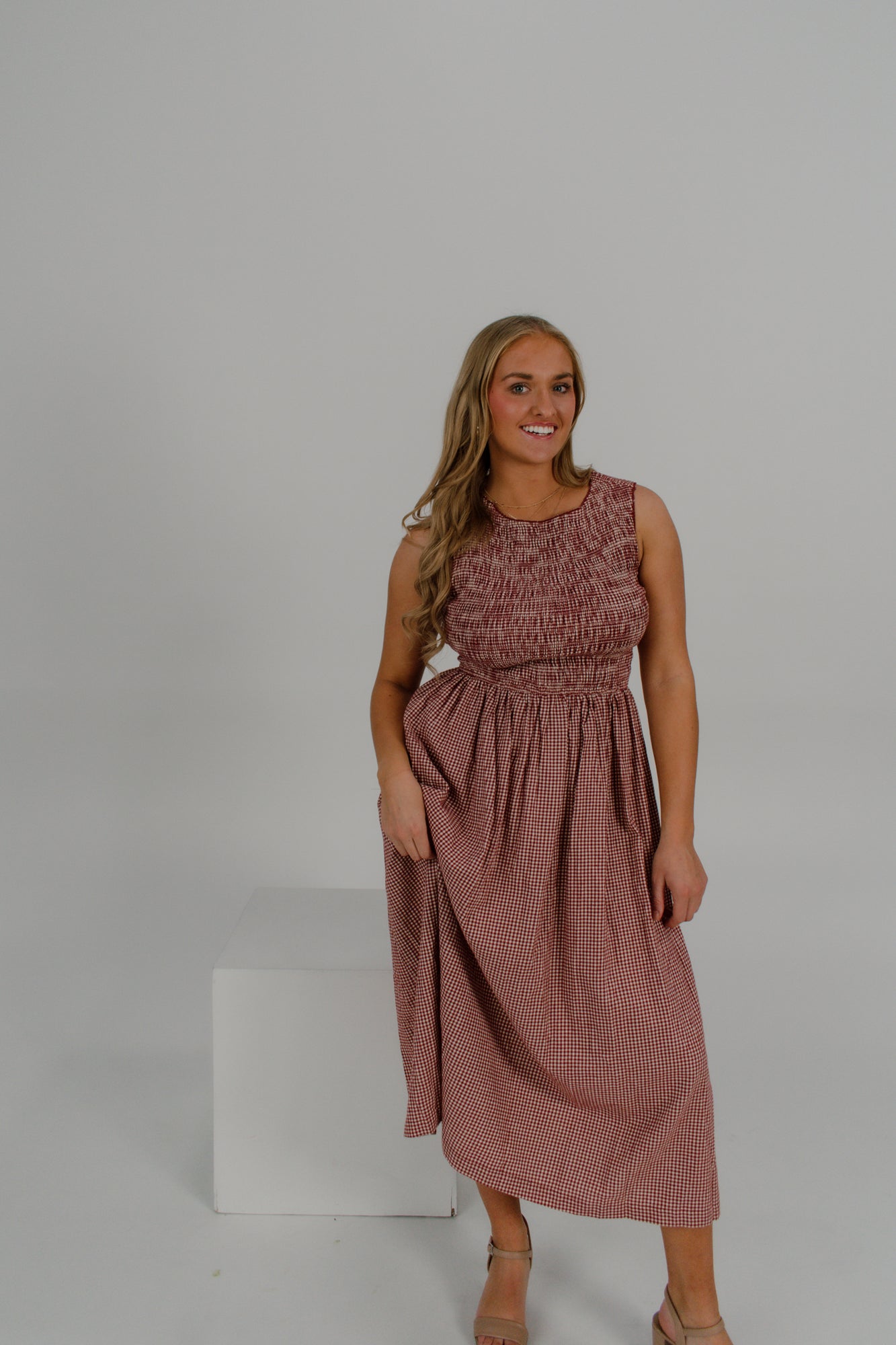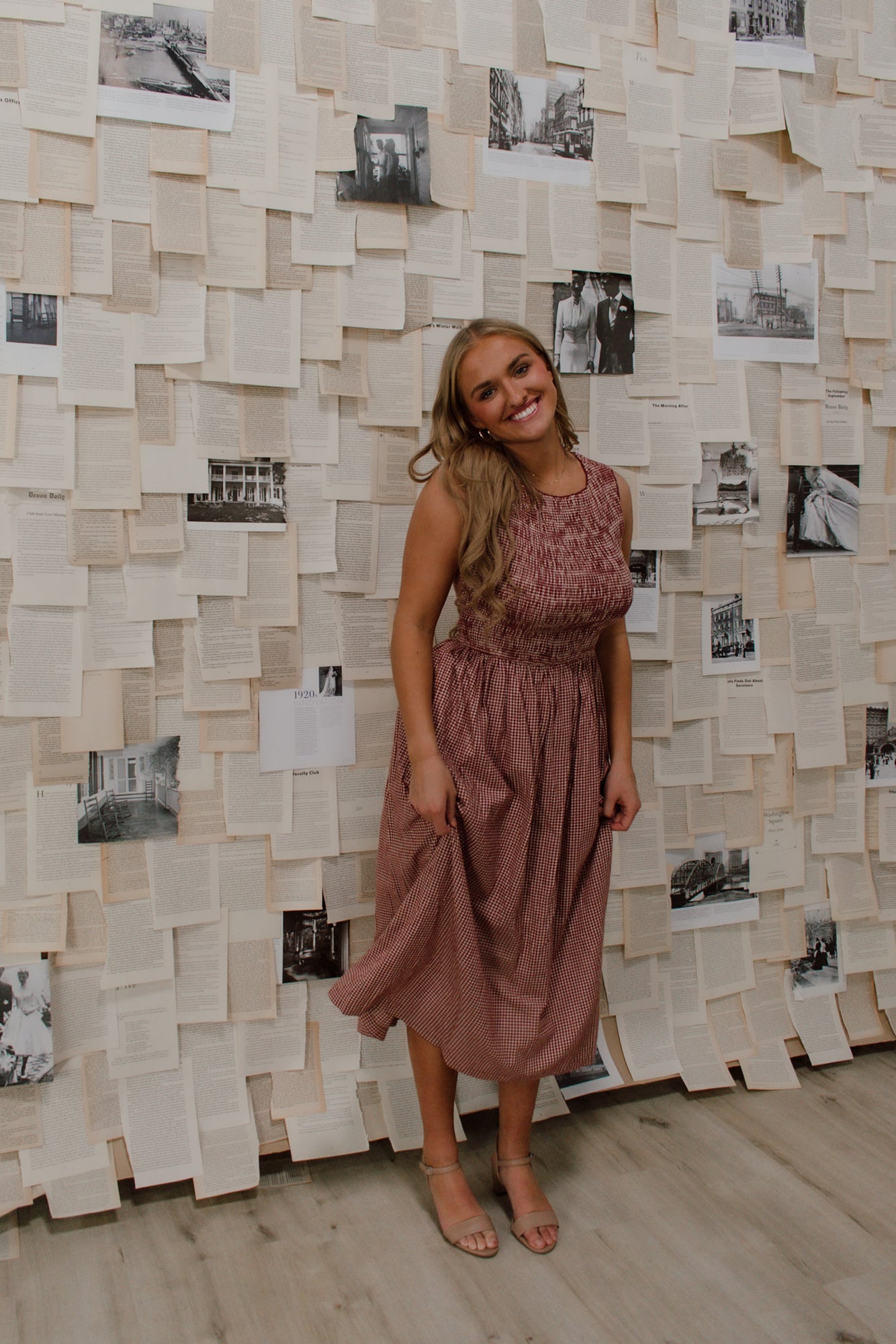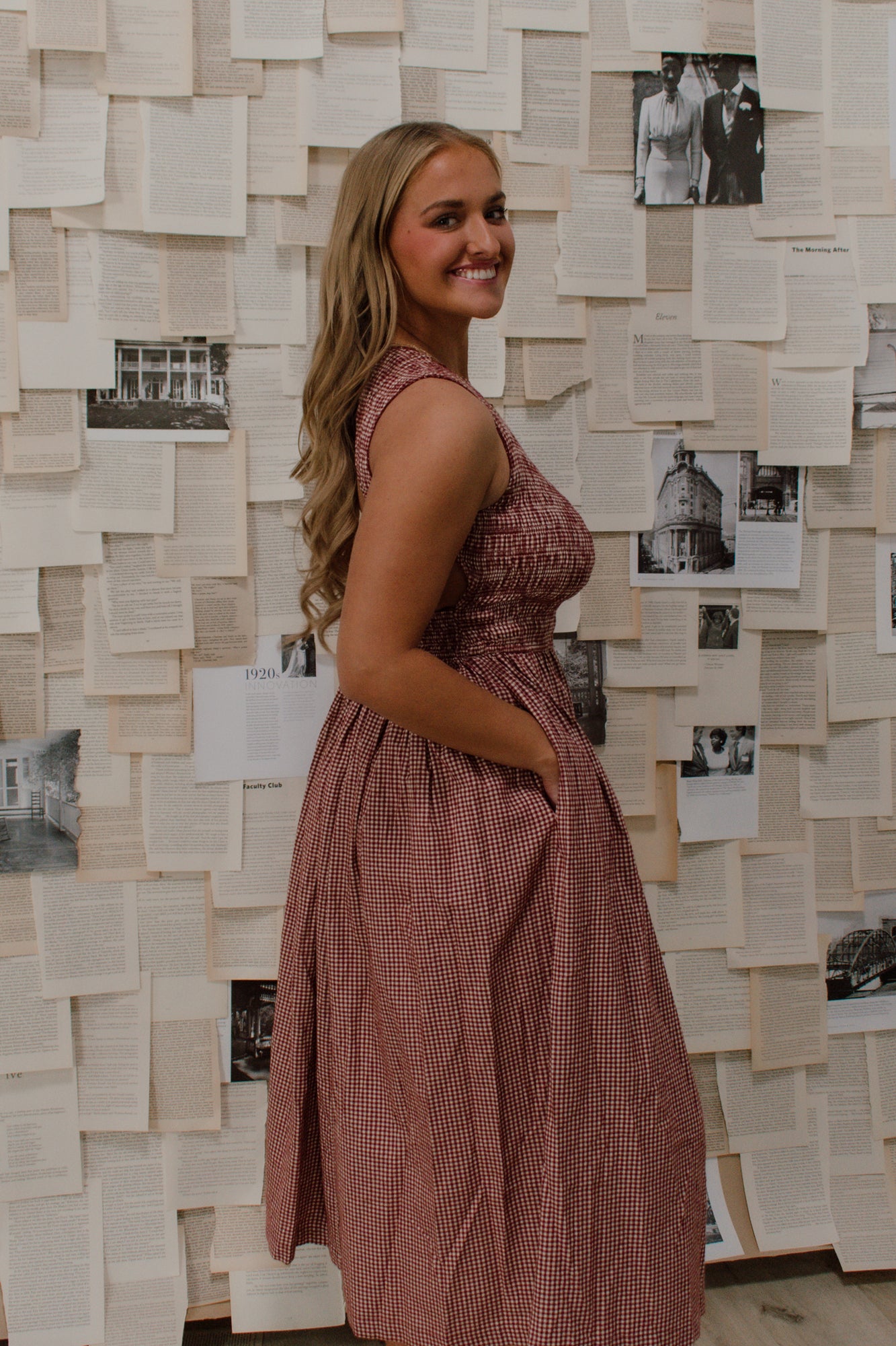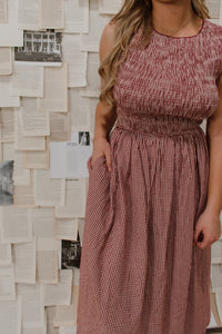Autumn dressed up in it's FINEST form in our new Charlotte Midi!! This adorable, chic gingham dress features a smocked top with a drop waist fit and open back. Features 2 side pockets (a game changer) and tie back for adjustability on the top.