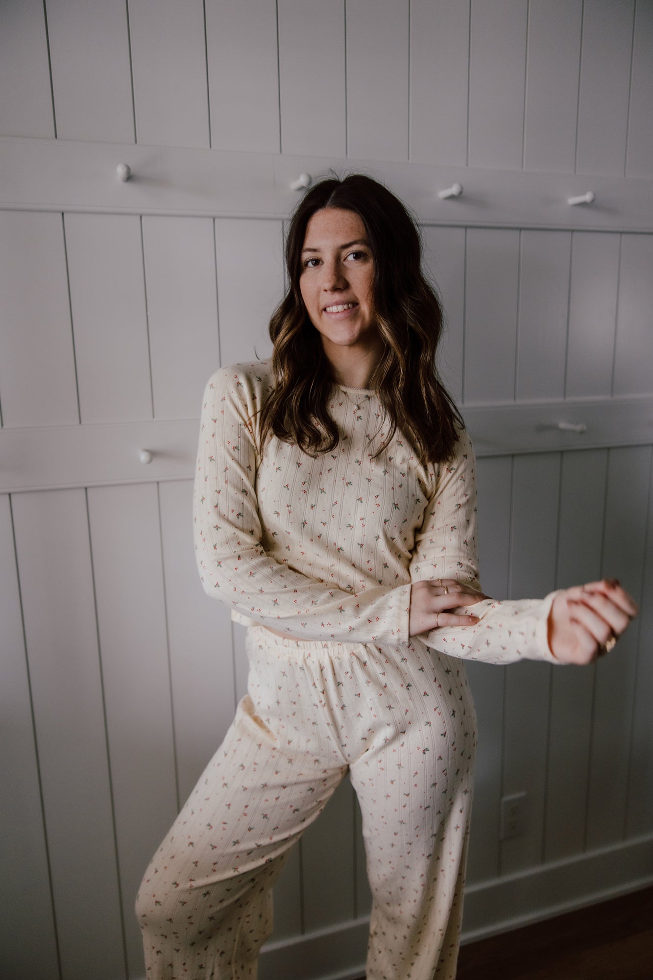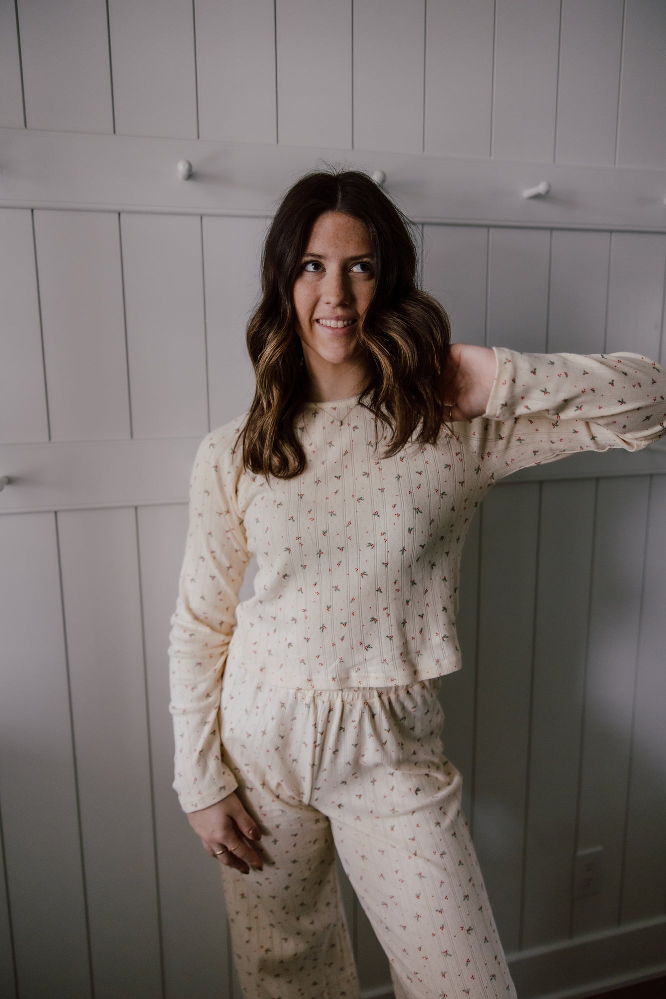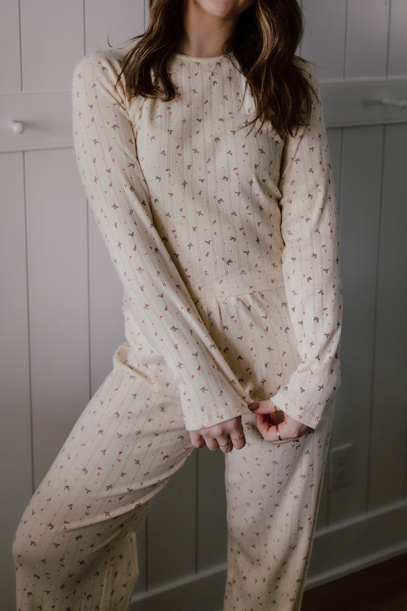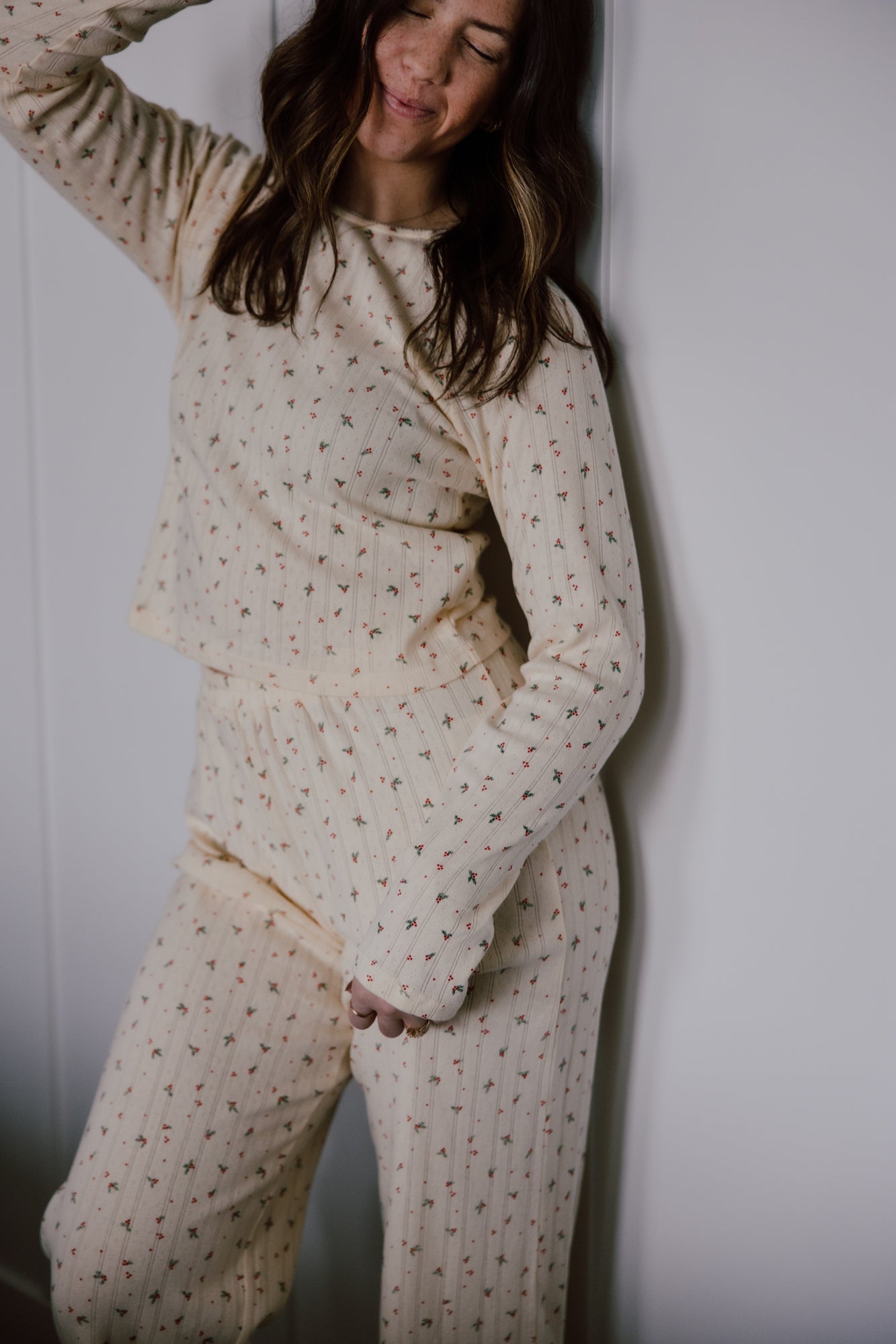 Nothing better than finding your new favorite lounge set for the holidays!! Our Kris Pointelle Set is PERFECT for all of your cozy holiday needs. The Kris Long Sleeve top is waist-length & features dainty lace trim on the collar with the cute, holly pattern across the cream top.