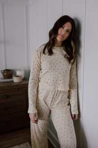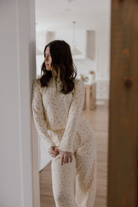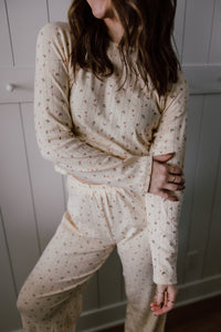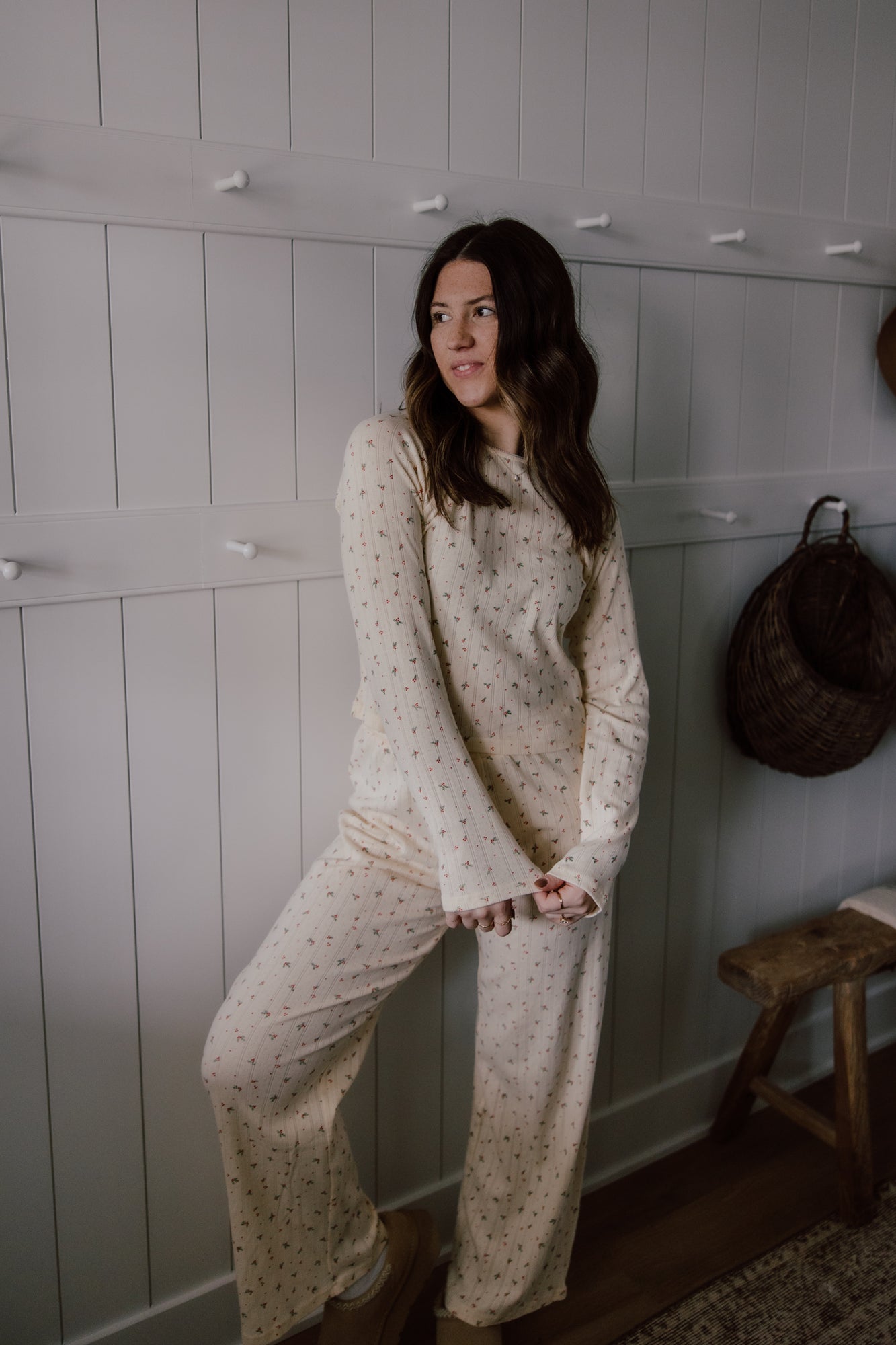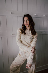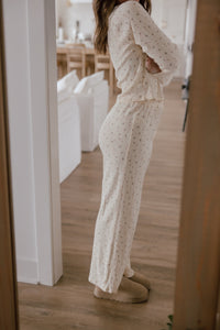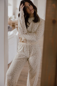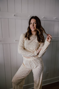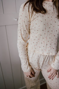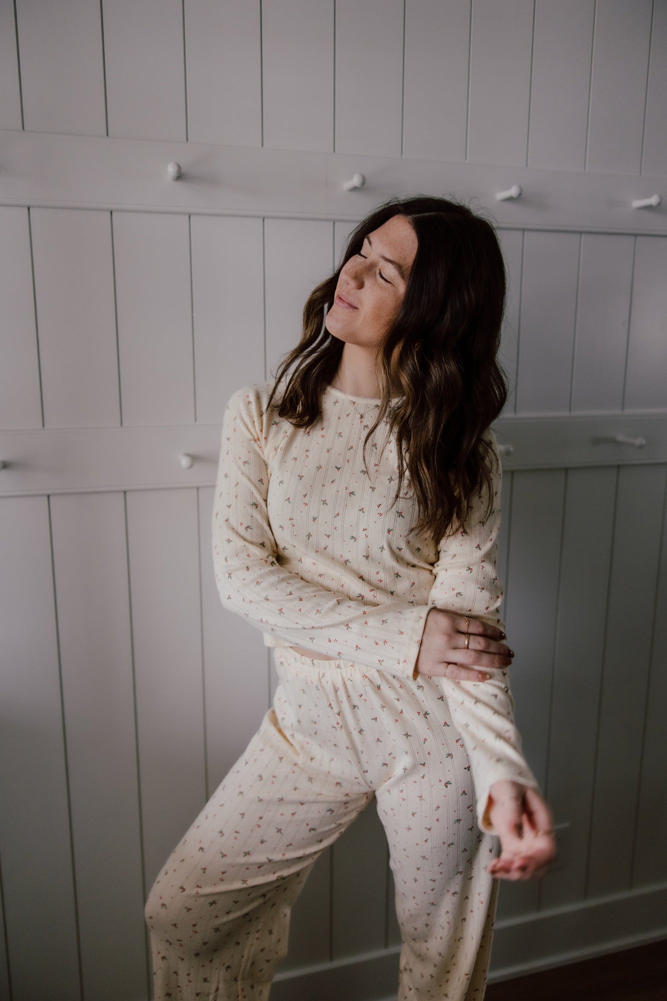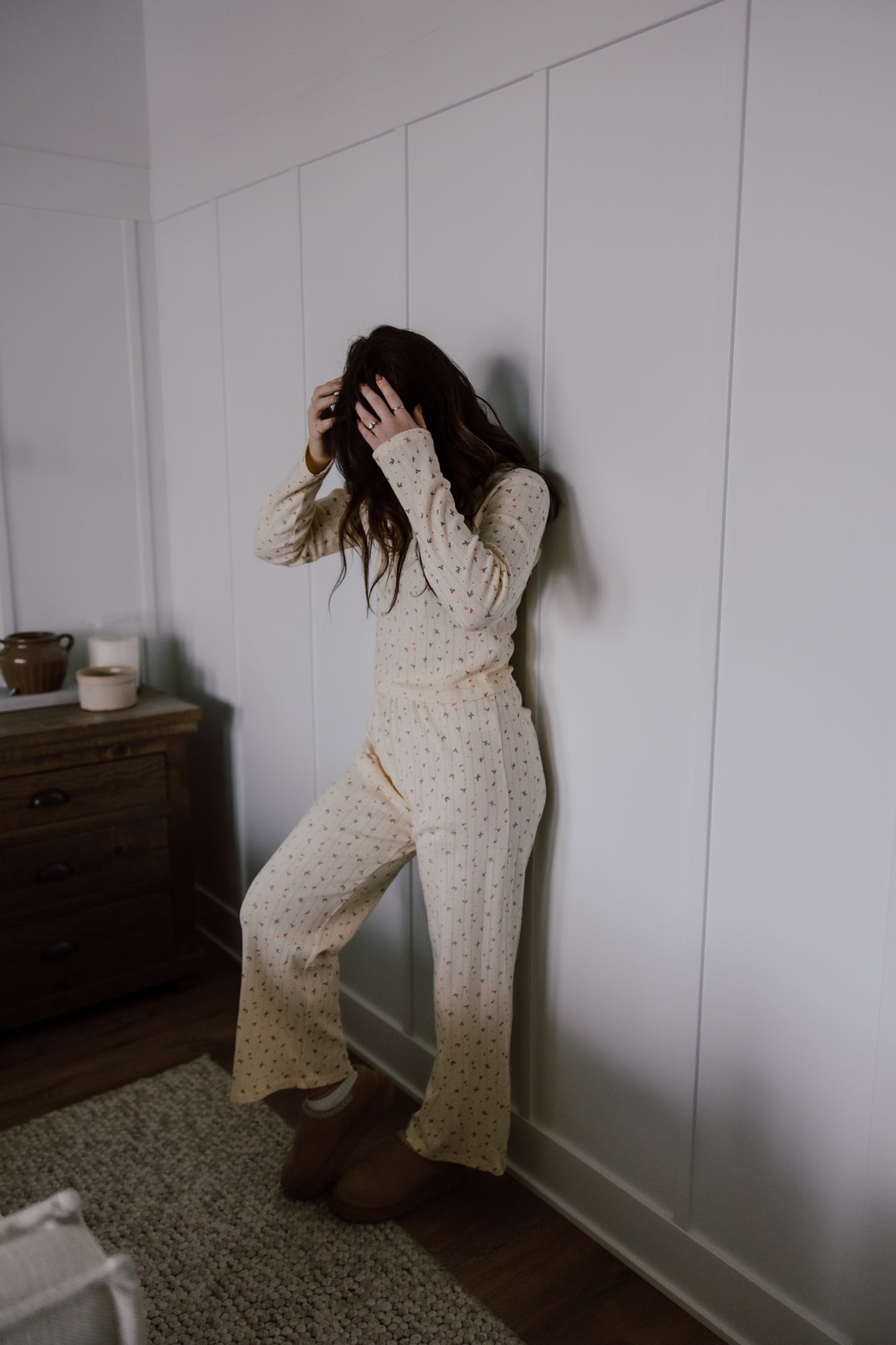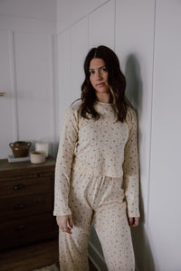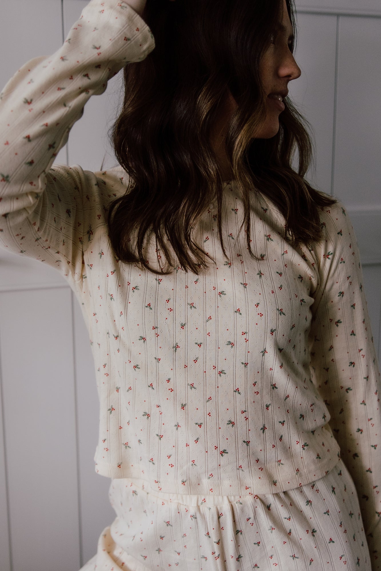 Nothing better than finding your new favorite lounge set for the holidays!! Our Kris Pointelle Set is PERFECT for all of your cozy holiday needs. The Kris Long Sleeve top is waist-length & features dainty lace trim on the collar with the cute, holly pattern across the cream top.