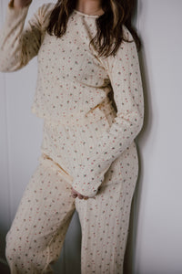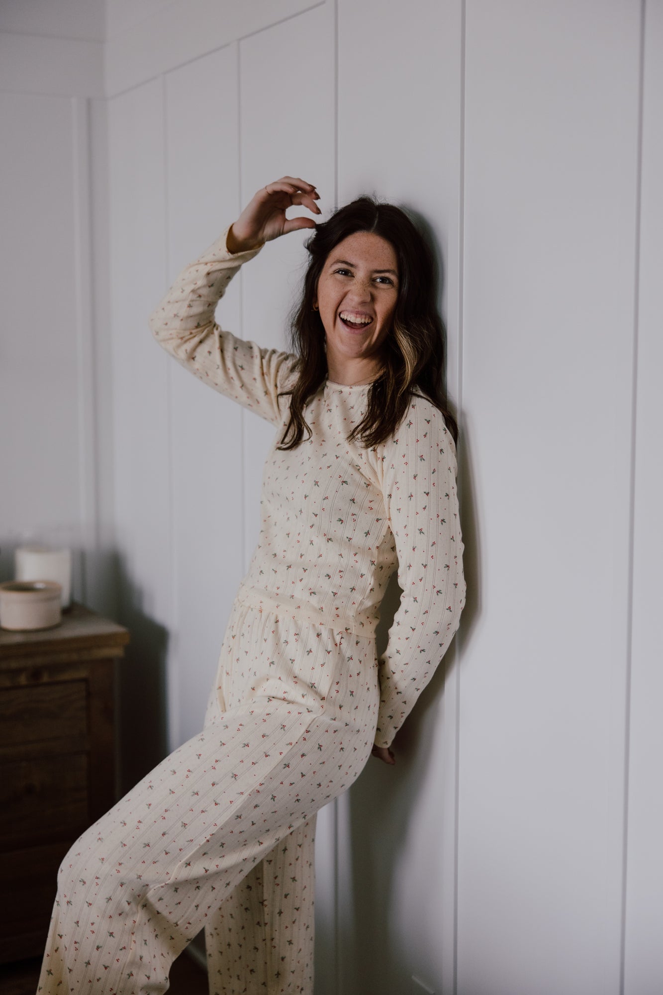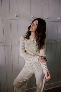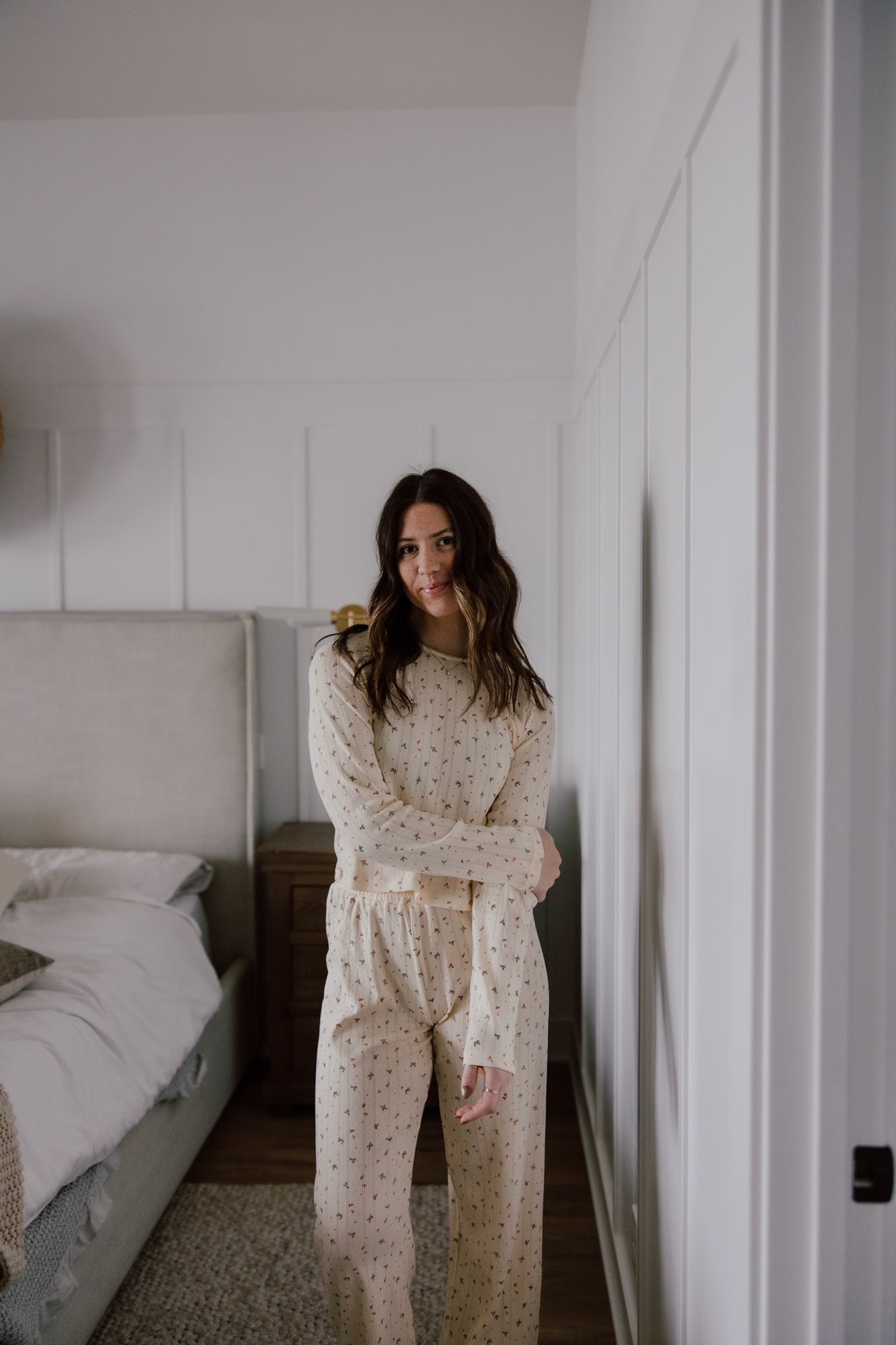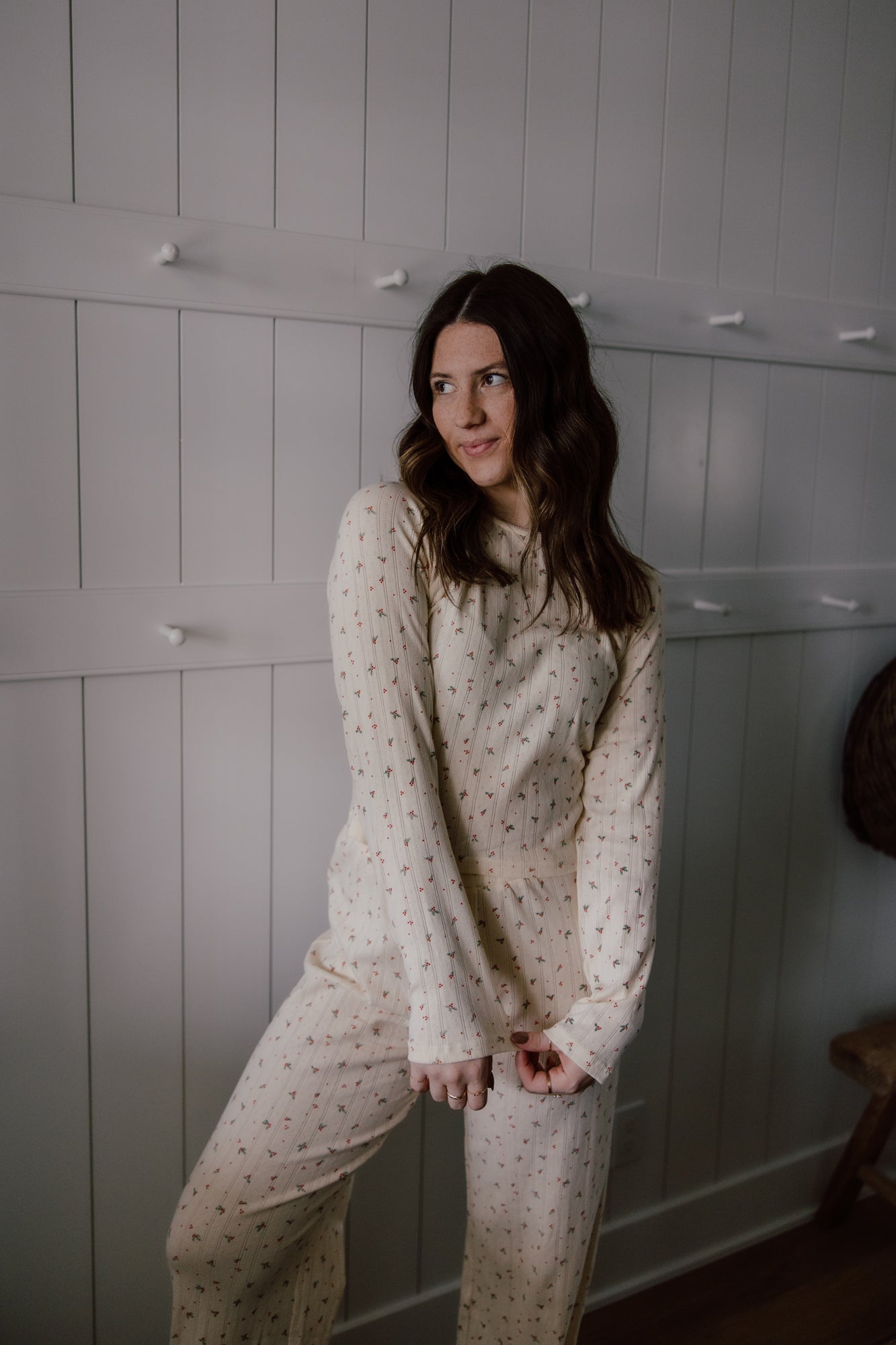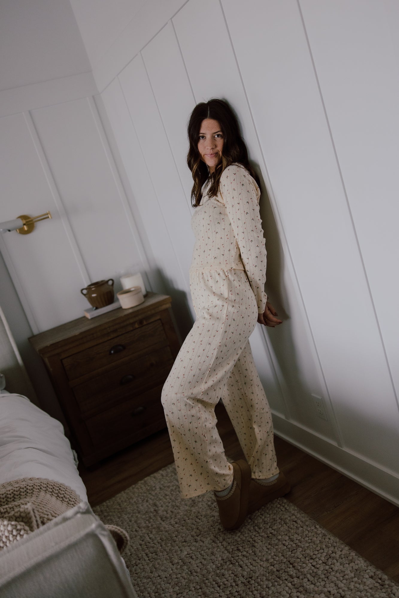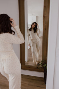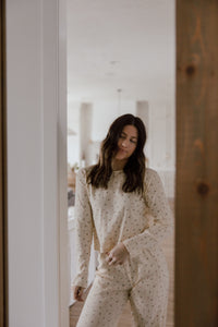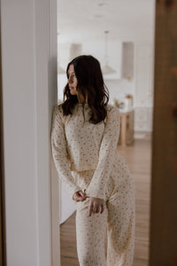 Nothing better than finding your new favorite lounge set for the holidays!! Our Kris Pointelle Set is PERFECT for all of your cozy holiday needs. The Kris Long Sleeve top is waist-length & features dainty lace trim on the collar with the cute, holly pattern across the cream top.